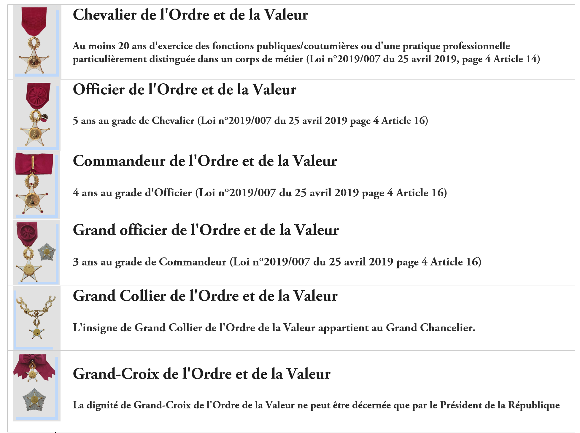 L'Ordre de la Valeur du Cameroun est destiné à récompenser, par une décoration officielle, les services éminents rendus à l’État du Cameroun. Des citoyens étrangers peuvent, sous réserve de certaines conventions internationales, être admis dans l'Ordre de la Valeur.